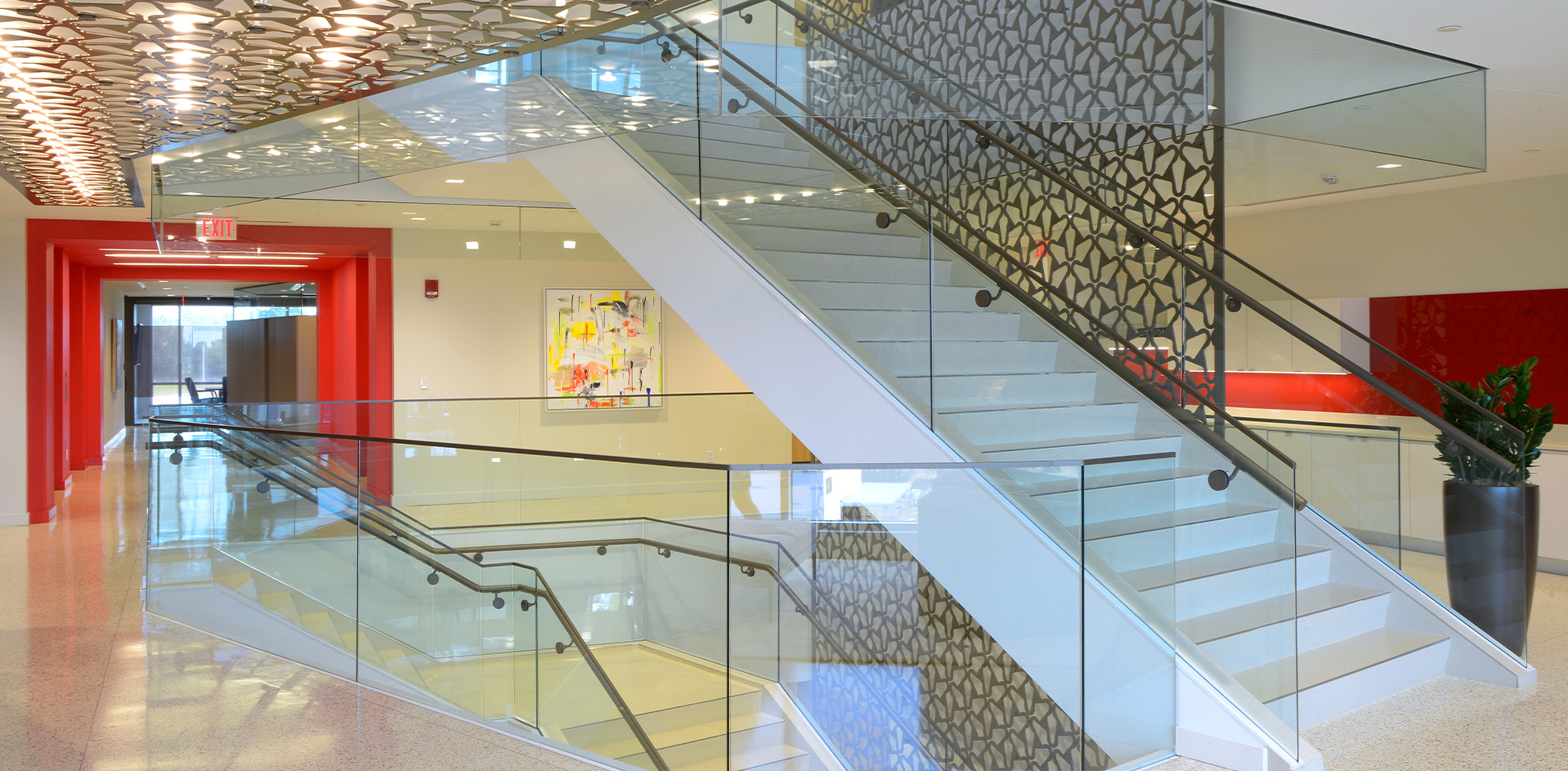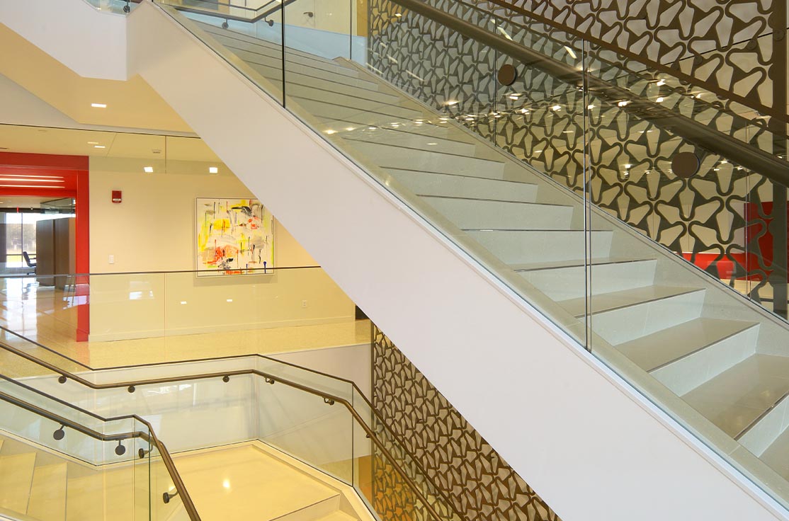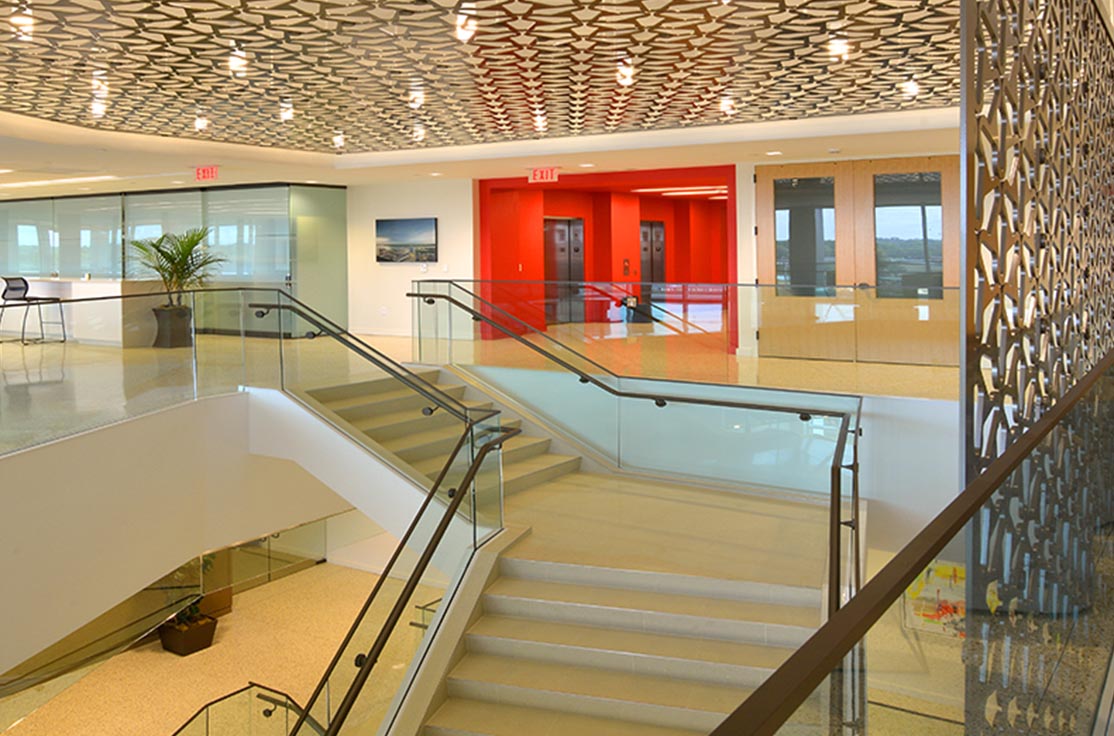The project encompassed the third, fourth, and fifth floors of Jackson’s newest developments, “The District.” The most prominent feature is a spectacular three-story monumental staircase, fitted with custom glass handrails. It is accentuated with a custom fabricated “Magnolia Screen” spanning all three floors and punctuated with dramatic accent lighting. Attorney offices are enclosed by custom colored butt-glazed aluminum storefront systems with laminated specialty glass. A multipurpose room, equipped with a vertical folding operable glass wall and state-of-the-art audio, visual, and lighting control, features high-end catering kitchens and a café. The schedule was organized in phases to accommodate the owners’ commitment to vacate their existing space.