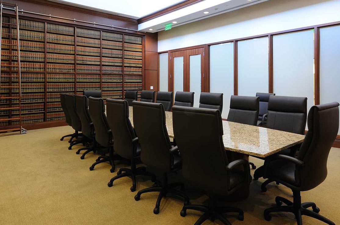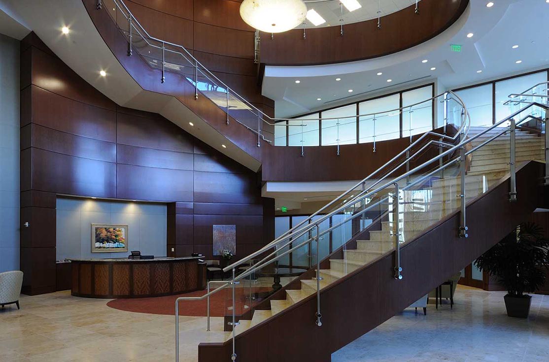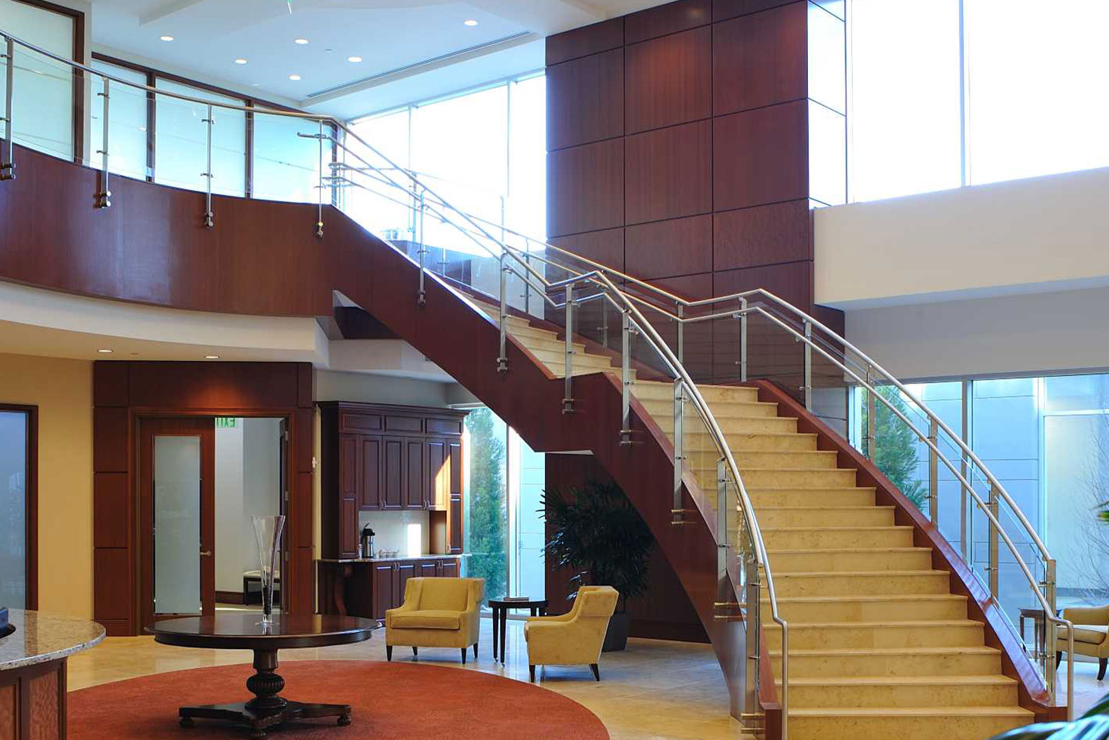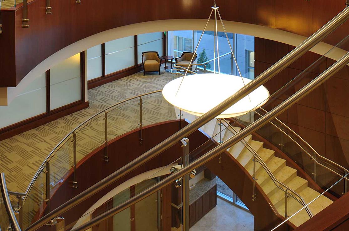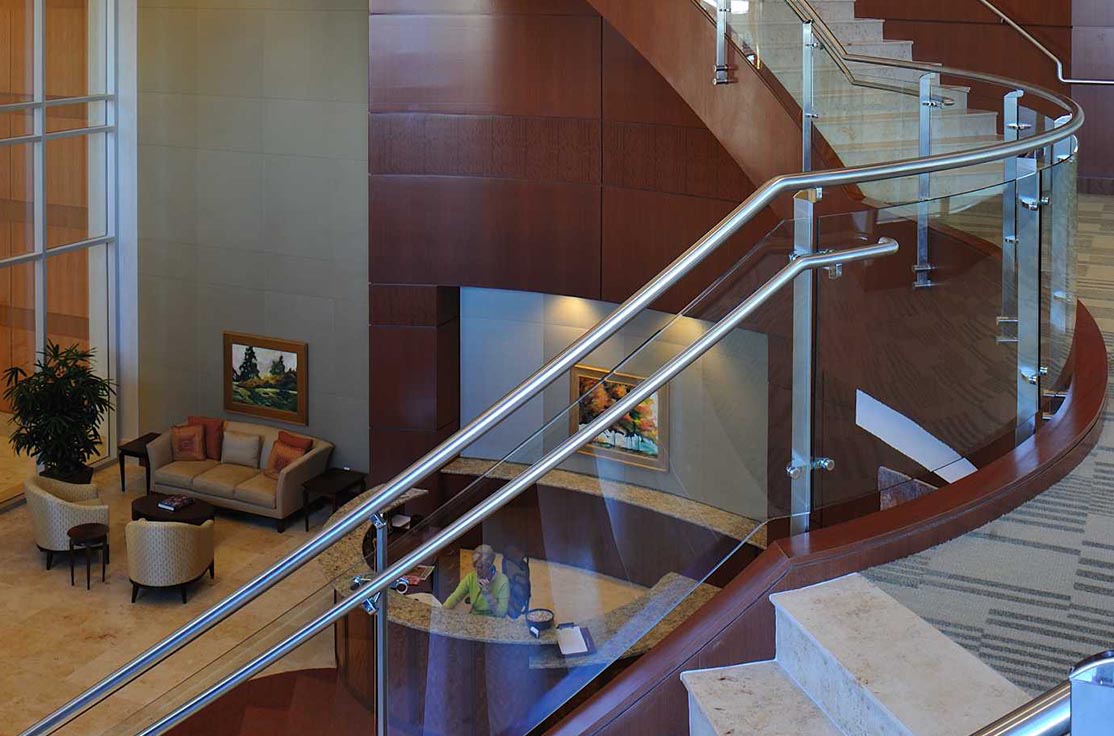 The most notable and challenging feature of this project was the elliptical-shaped monumental stairs spanning three floors. Mahogany veneer panels were applied to the sides, limestone installed over the treads and risers, and a continuous glass handrail system installed along the entire length. The result is breathtaking.