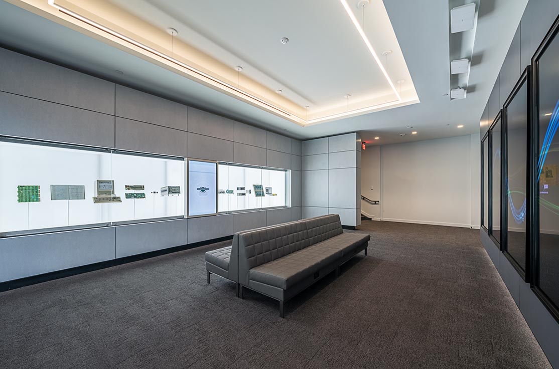 This is a small project with a BIG story. NI (formerly National Instruments) tells its story in its Founders Hall, where the company and its technologies are put into a sparkling display space with an interactive timeline to explore its 40-year history.