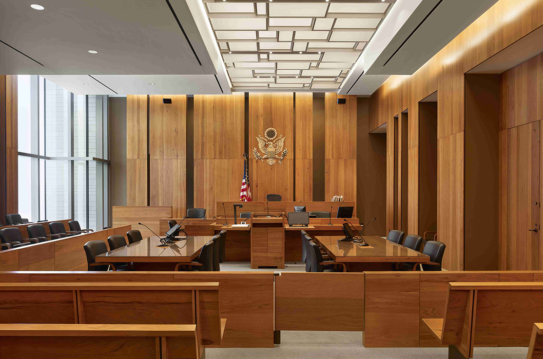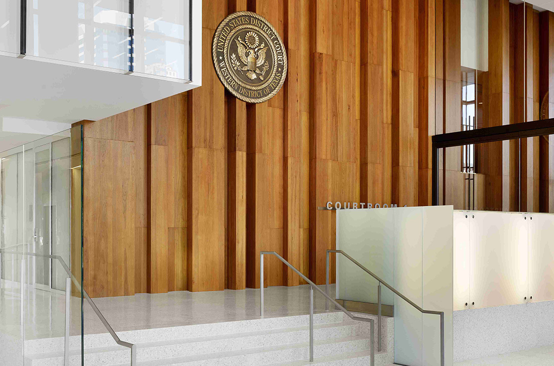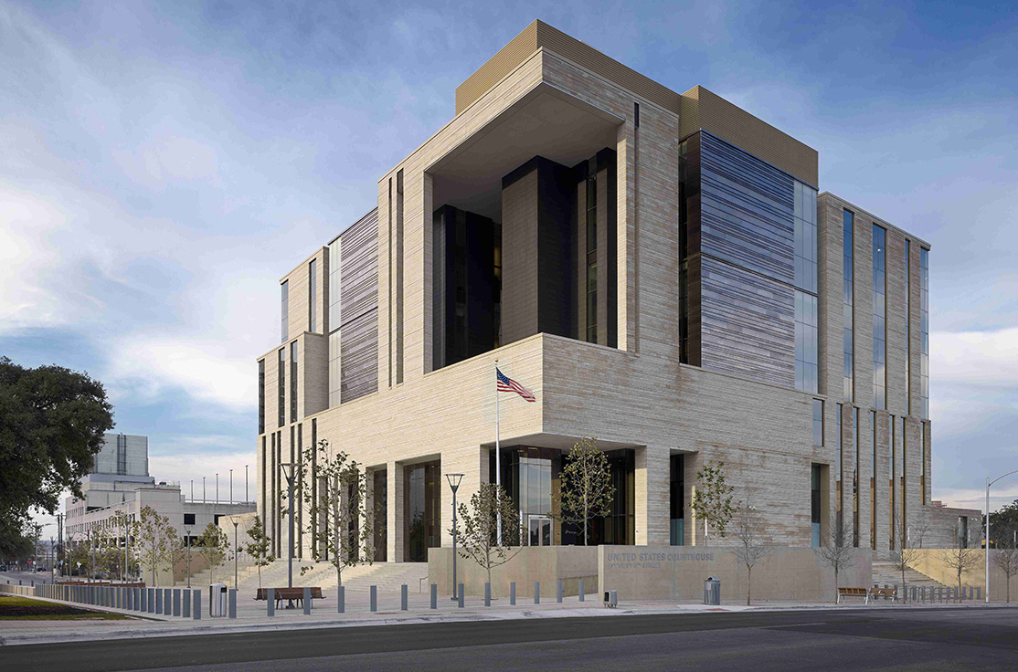 The nine-story facility—basement, seven levels and penthouse—houses U.S. Federal Judges chambers and eight courtrooms, with expansion for one addition within the existing footprint. It features hardened requirements with perimeter security measures. Additional work incorporated into the project was the extensive relocation of existing utilities.